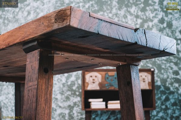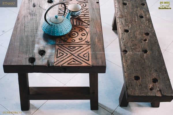 Hoa văn lượn một đường trên bàn gỗ tàu thuyền làm điểm nhấn cho 1 chiếc bàn đơn, ghế băng dài đơn, sự kết hợp nào cũng thật ấn tượng, mang dấu ấn cá nhân. Bàn mang sắc màu cổ điển nhưng rất hợp thời đại, bàn có thể là bàn ăn, bàn trà, bàn tiếp khách, bàn sofa, hay decor áp tường đặt những món đồ kỷ niệm giá trị.