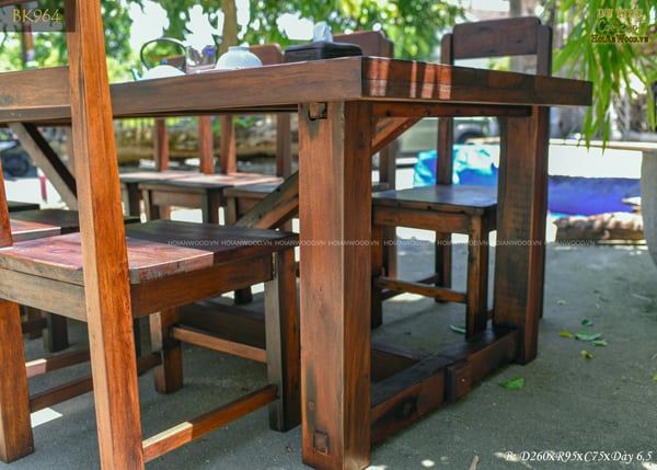Mặt bàn dày 4cm, bo viền 6,5cm. Khung ghế vuông làm điểm tựa chắc chắn cho khối mặt bàn lớn. Gỗ tàu được chọn lựa kỹ càng, nước sơn mộc mạc gần gũi thân thuộc, nhưng đảm bảo độ sắc nét và sử dụng tốt an toàn lâu dài.