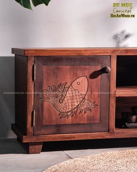 Tủ gỗ Decor - trong thiết kế quen thuộc nhưng giao diện thu hút hơn, hòa quyện vào tâm trí hơn với từng đường nét tủ thanh thoát, sắc nâu ấm, họa tiết cá chép làm điểm nhấn, hàm ý biểu tượng của sự kiên trì, nỗ lực và may mắn. Cá chép, sắc sảo, vươn mình, thịnh vượng, nhưng cũng mang đầy kiêu hãnh, uyển chuyển và thướt tha. Xứng đáng cho một chiếc tủ đậm nét văn hóa để decor tại gia, dành cho đặt tivi, sách báo, lưu trữ những đồ vật ý nghĩa.