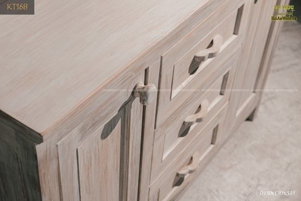 Tủ gỗ bắt mắt bởi sắc sơn hiệu ứng trắng rất nghệ thuật.